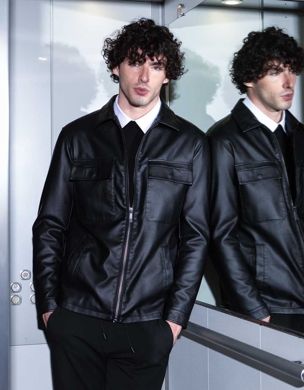 MODEL HEIGHT 185cm - SIZE L Leather-effect shirt jacket with zip fastening. Side pockets and large chest...
