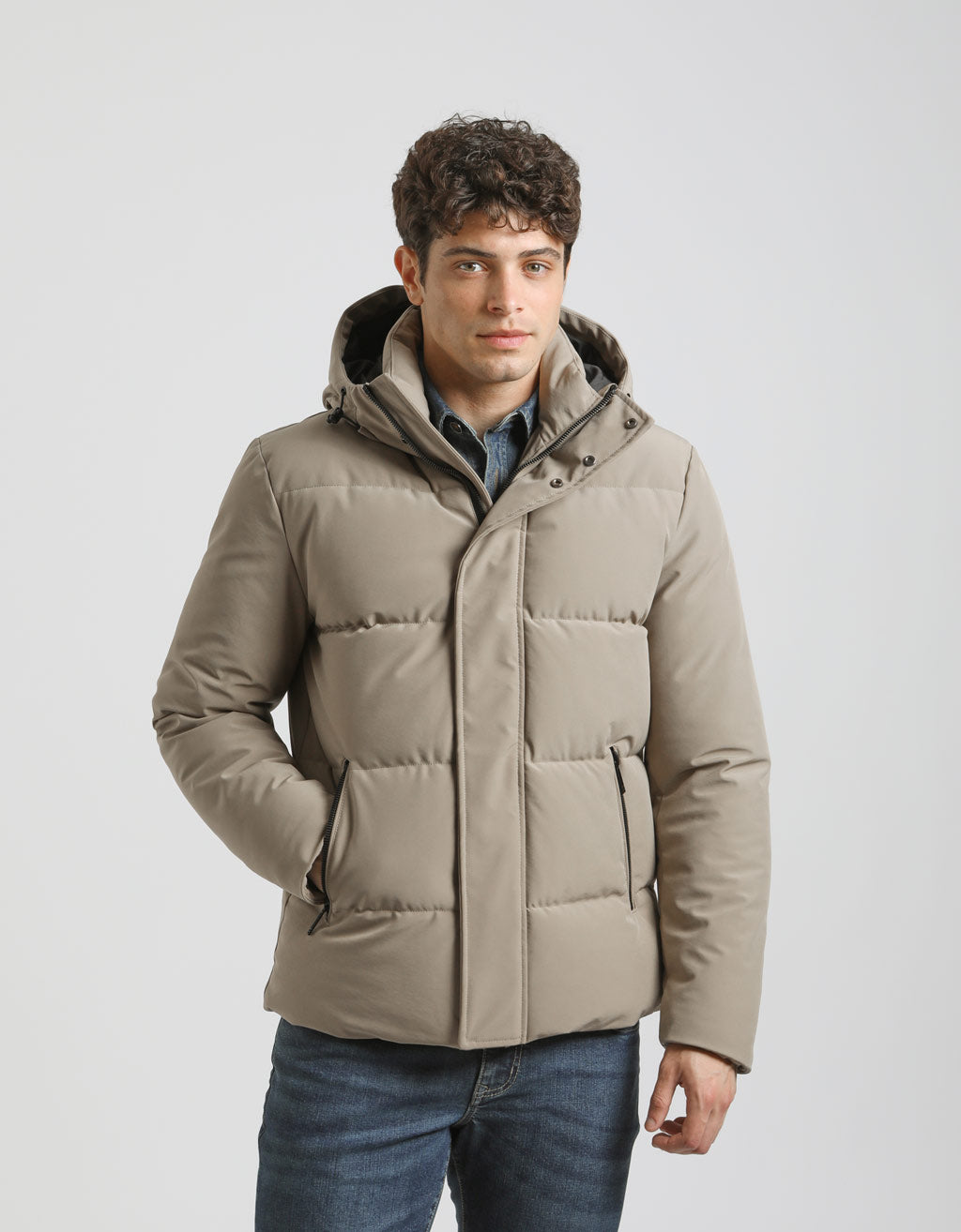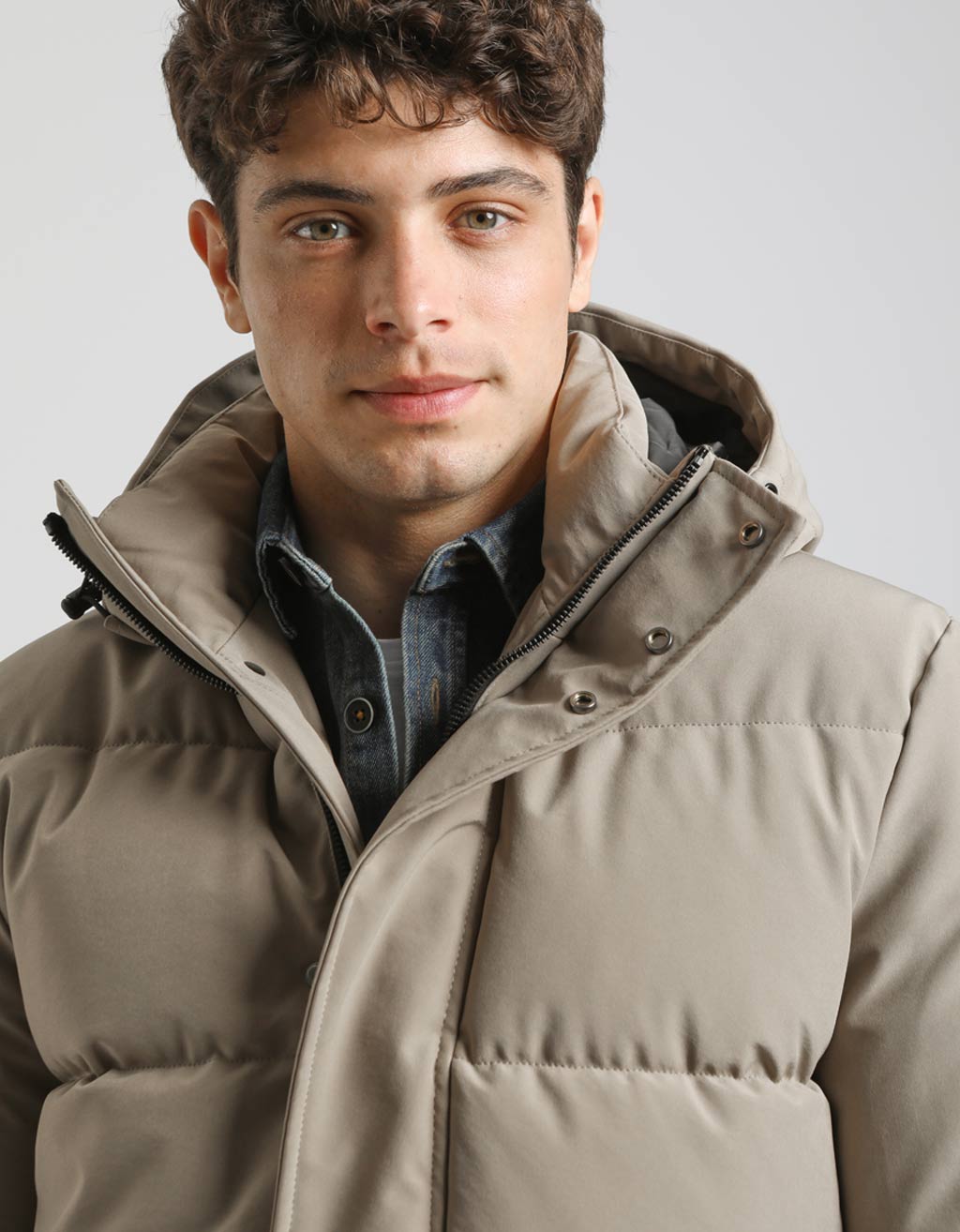 MODEL HEIGHT 185cm - SIZE L Padded jacket with hood. Front zipper closure and zippered side pockets.