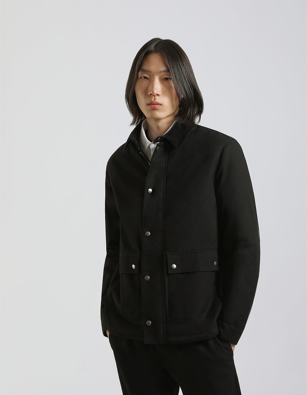MODEL HEIGHT 185cm - SIZE L Cotton jacket with mock neck and buttoned side pockets.