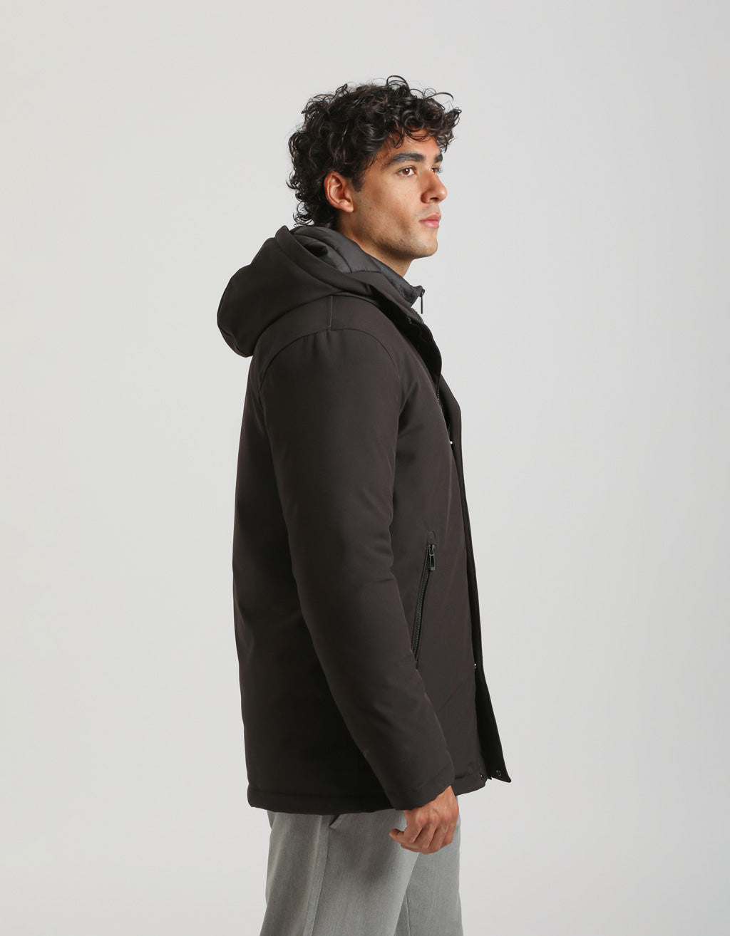 MODEL HEIGHT 185cm - SIZE L Long duster jacket with hood and vest, contrasting zipper closure and...