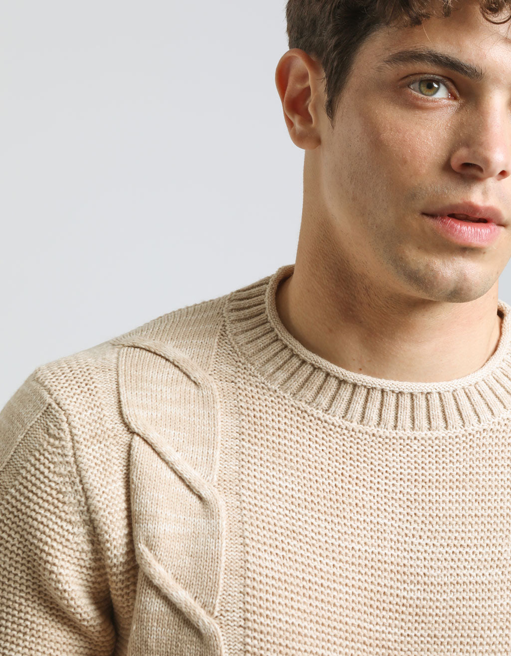 MODEL HEIGHT 185cm - SIZE L Mock neck sweater with braid. Solid colour, long sleeves and ribbed...