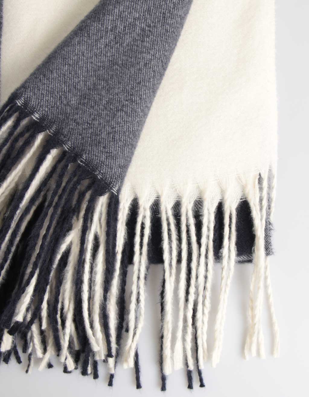 Check patterned scarf with frayed edges. Measurements: 72 cm x 193 cm.