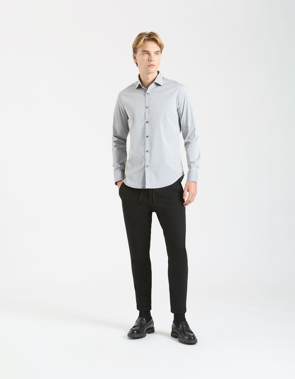 MODEL HEIGHT 185cm - SIZE L Solid-color cotton shirt in stretch fabric with classic collar and long...