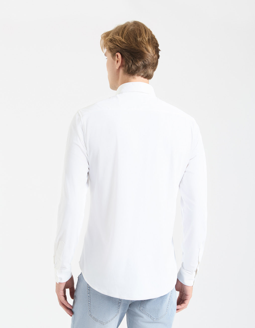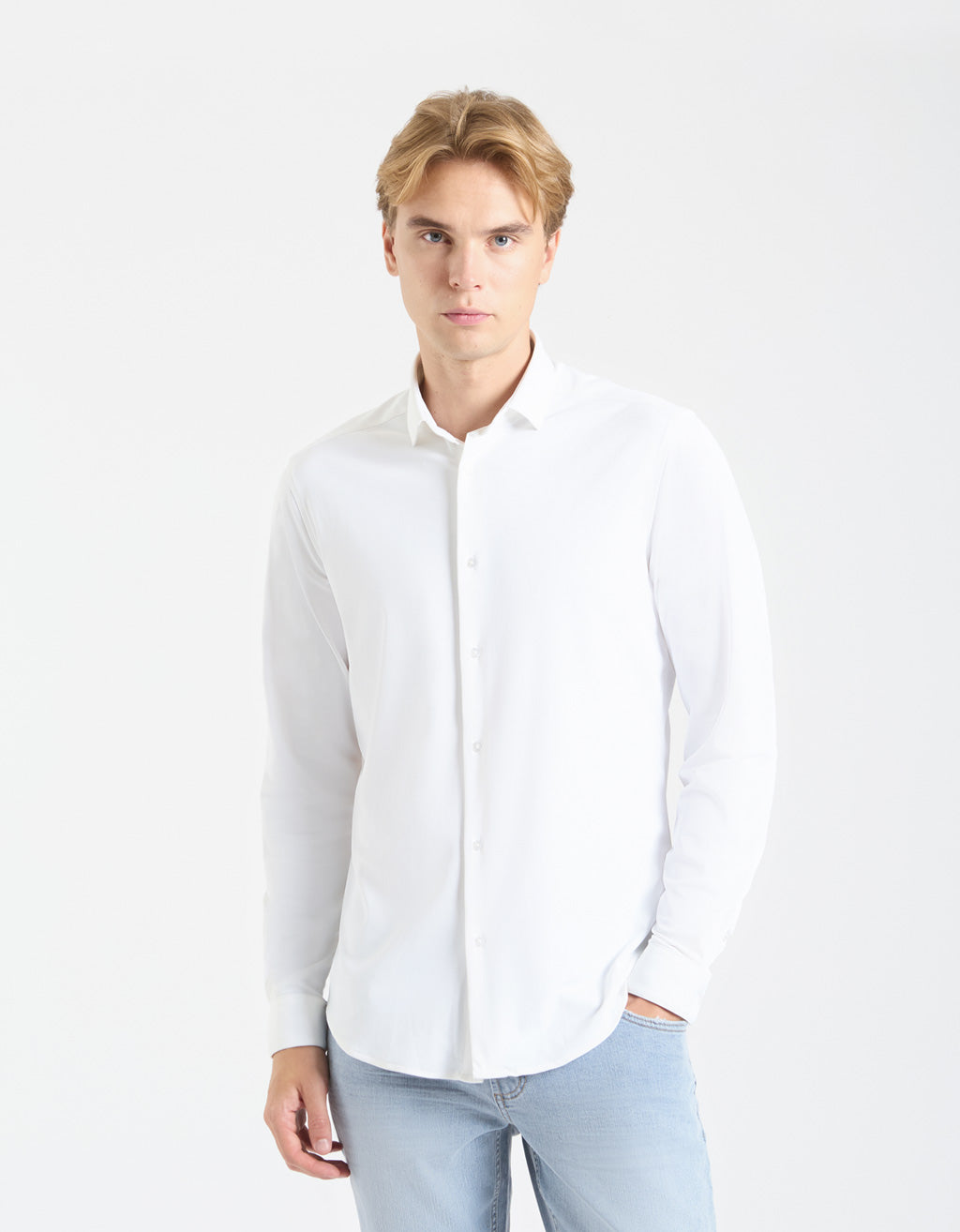 MODEL HEIGHT 185cm - SIZE L Solid-color shirt in stretch fabric with classic collar and long sleeves....