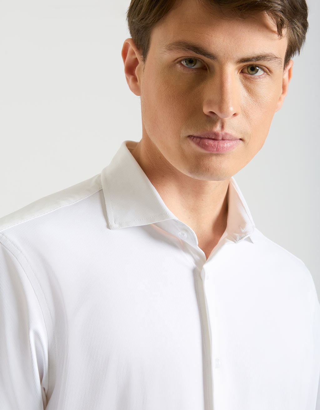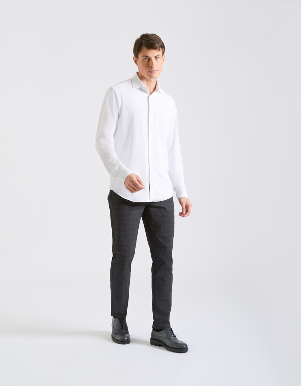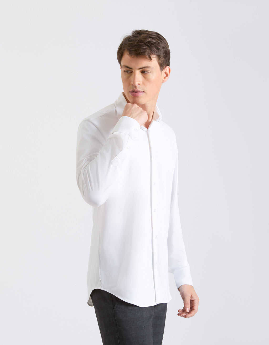 MODEL HEIGHT 185cm - SIZE L Solid-color shirt in stretch fabric with classic collar and long sleeves....