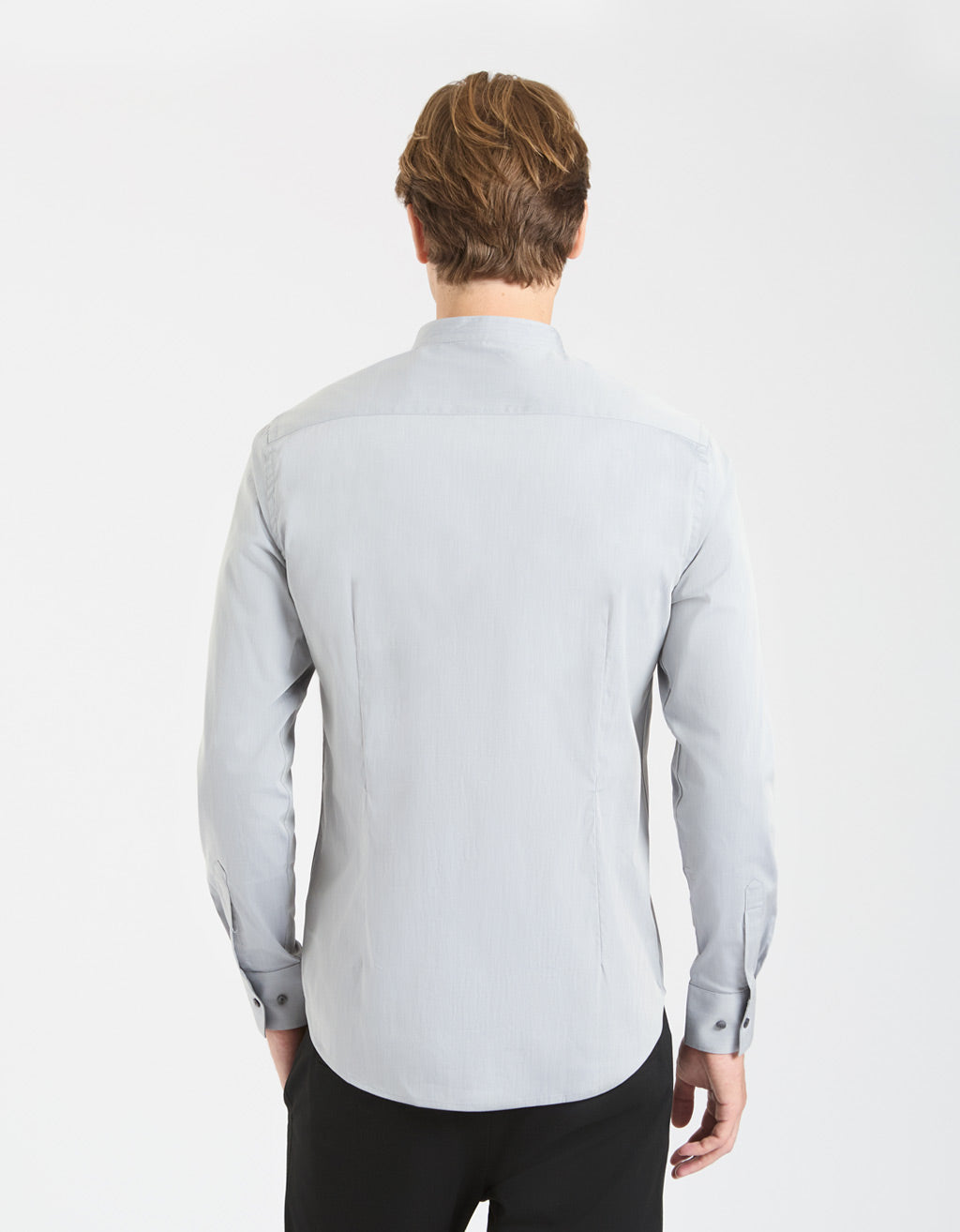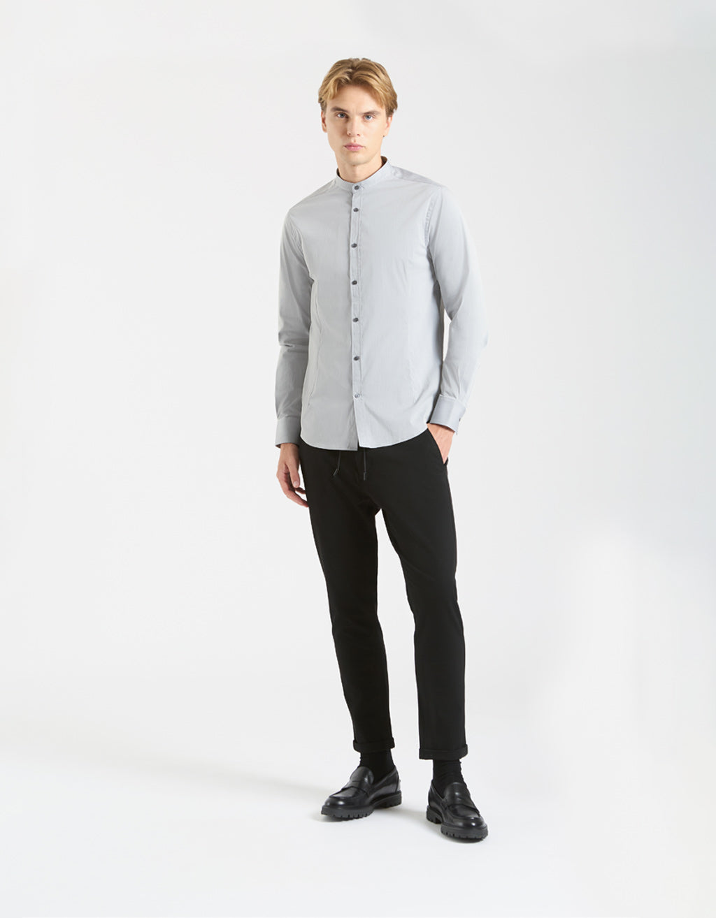 MODEL HEIGHT 185cm - SIZE L Stretch long sleeve shirt with mandarin collar. Plain color with contrast...