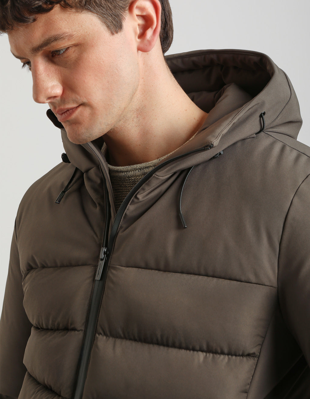 MODEL HEIGHT 185cm - SIZE L Padded jacket comined with hood. Front zipper closure and zippered side...