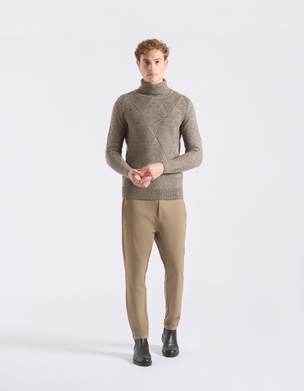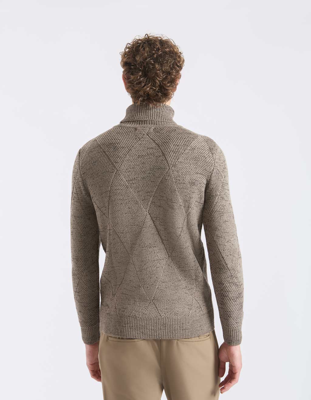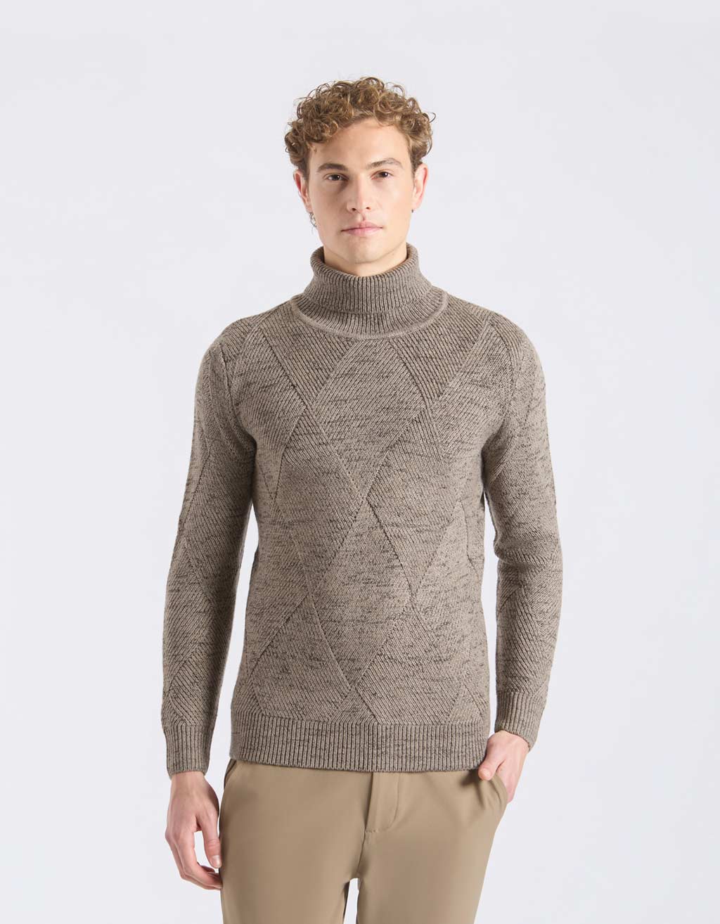 MODEL HEIGHT 185cm - SIZE L Turtle neck sweater with braided texture. Solid color and long sleeve.