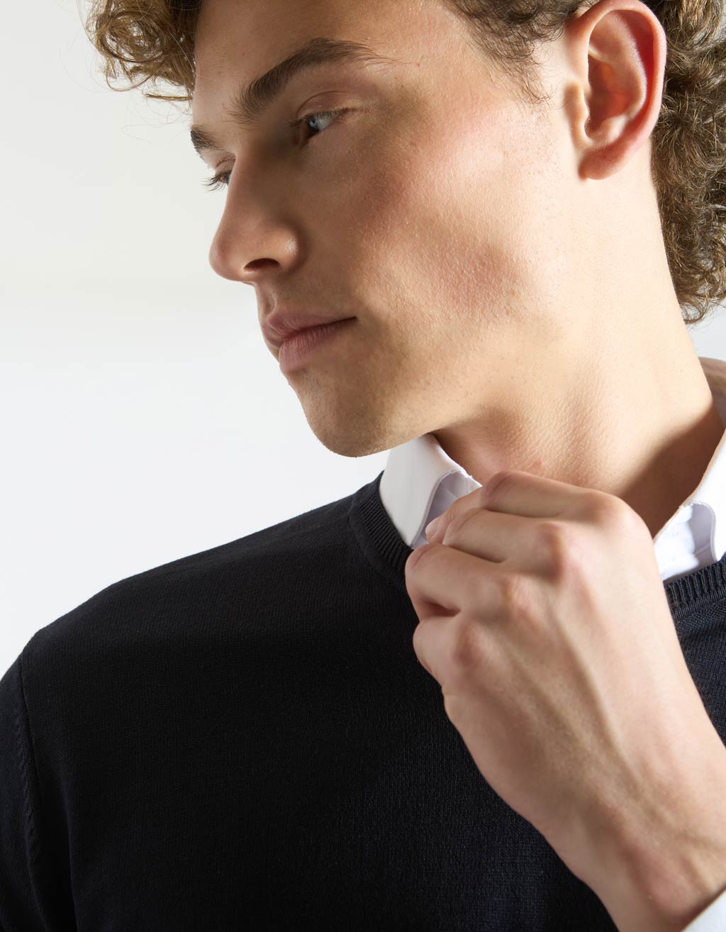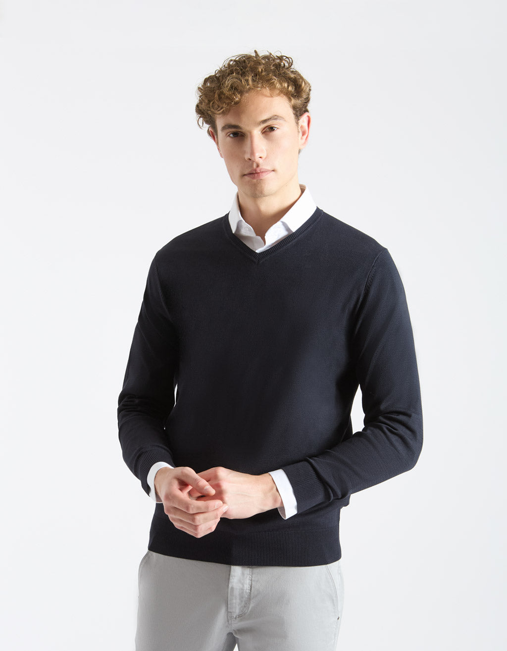 MODEL HEIGHT 185cm - SIZE L Basic viscose sweater with V-neck. Solid color and long sleeve.