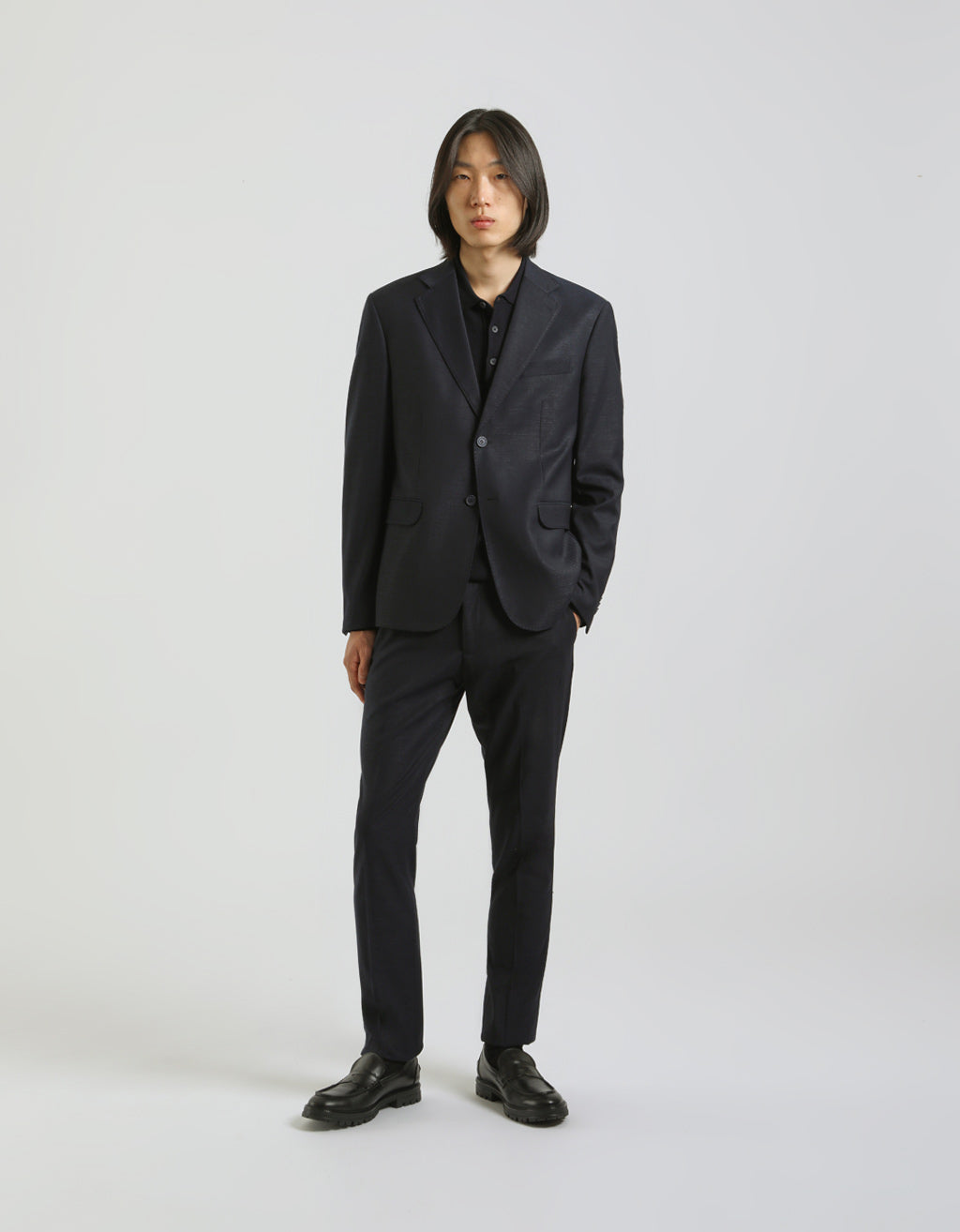 ALTEZZA MODELLO 185cm - TAGLIA 52 Abito tinta unita con chiusura a due bottoni, tasche con pattina e taschino a filetto sul petto. Polsini con bottoni. Due taschini interni. Pantaloni con tasche laterali anteriori e tasche a filetto posteriori. Chiusura con bottone e zip.