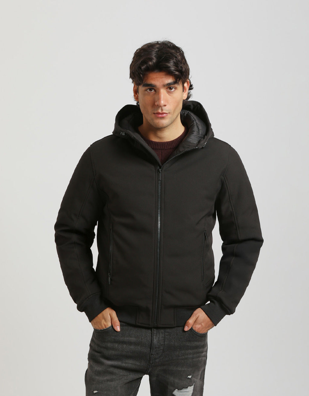 ALTEZZA MODELLO 185cm - TAGLIA L Giubbotto bomber imbottito con cappuccio. Chiusura frontale con zip e tasche laterali con zip.