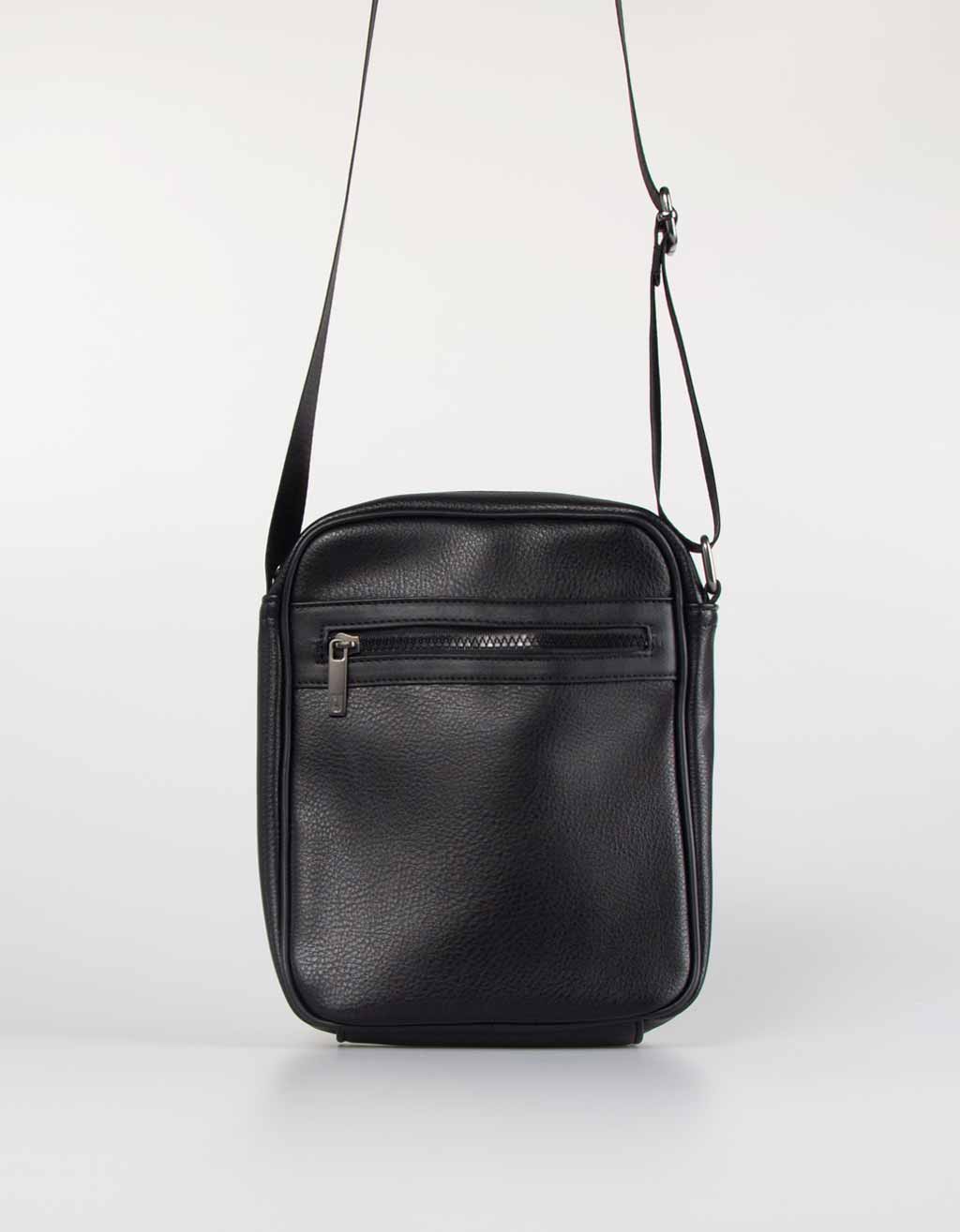 Borsello effetto pelle con tasca zip frontale. Chiusura a zip. Tasche interne e tracolla regolabile.