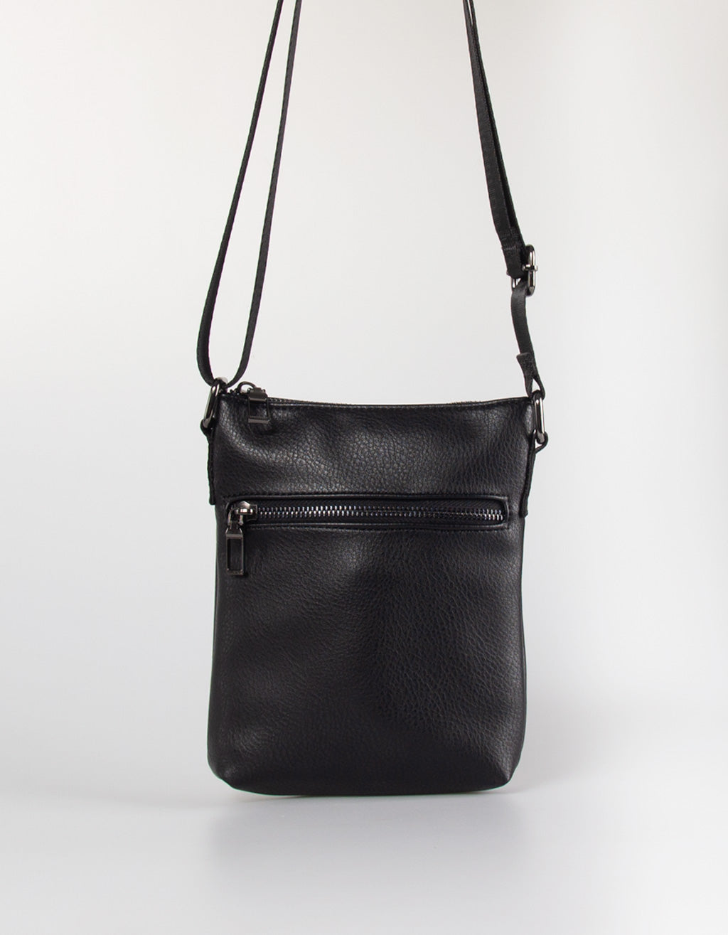 Borsello in materiale effetto pelle. Chiusura a zip. Tasche interne e tracolla regolabile.