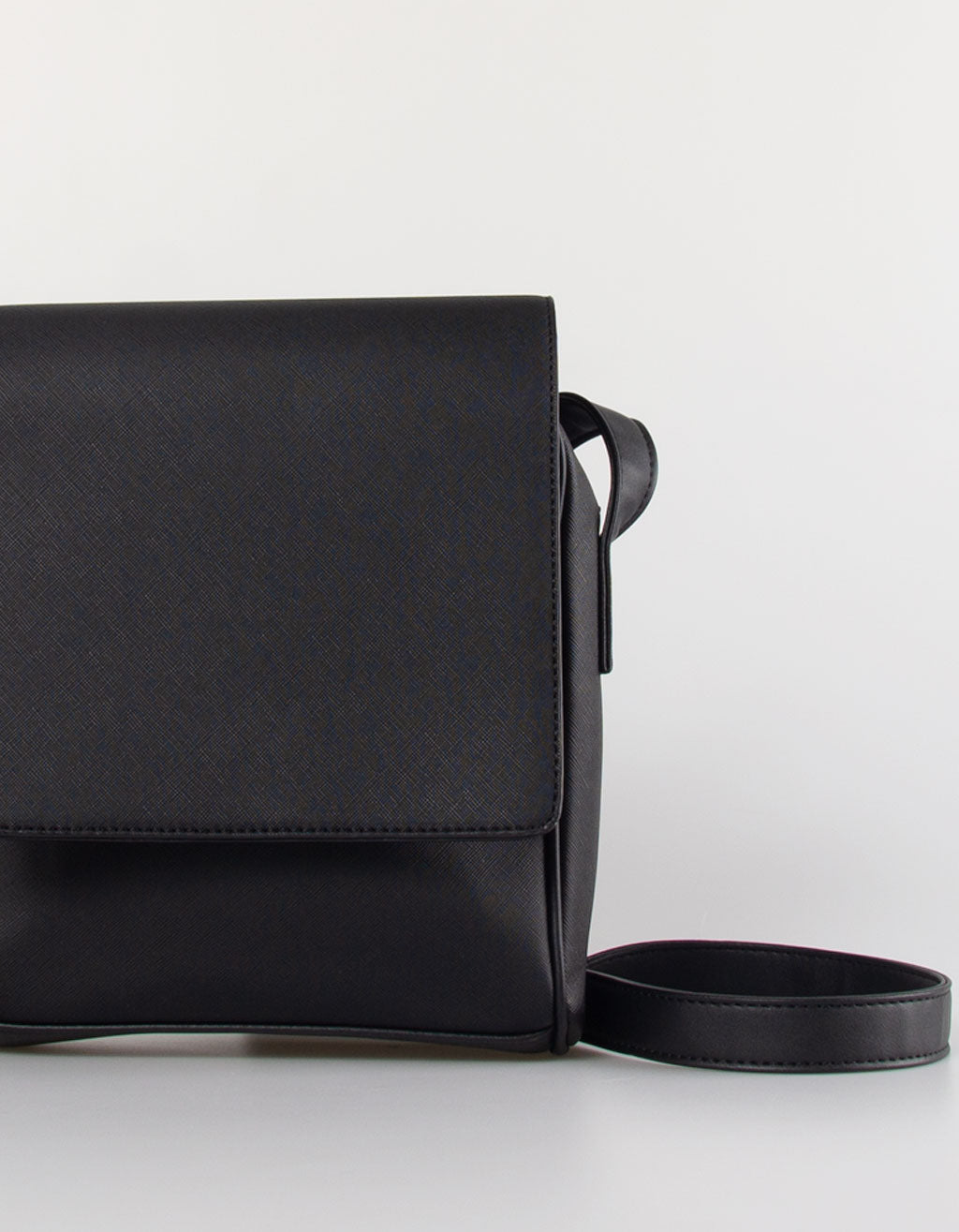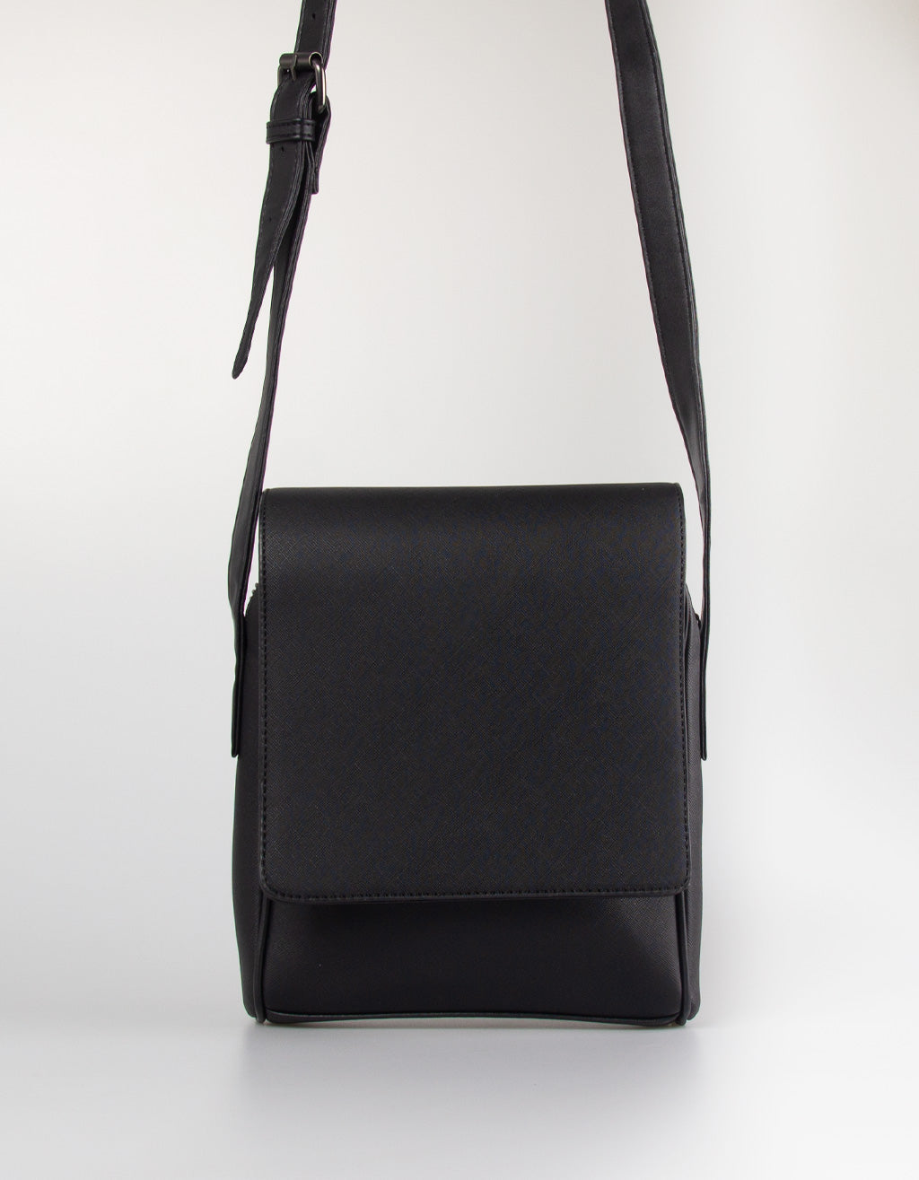 Borsello in materiale effetto pelle. Chiusura a zip. Tasche interne e tracolla regolabile.