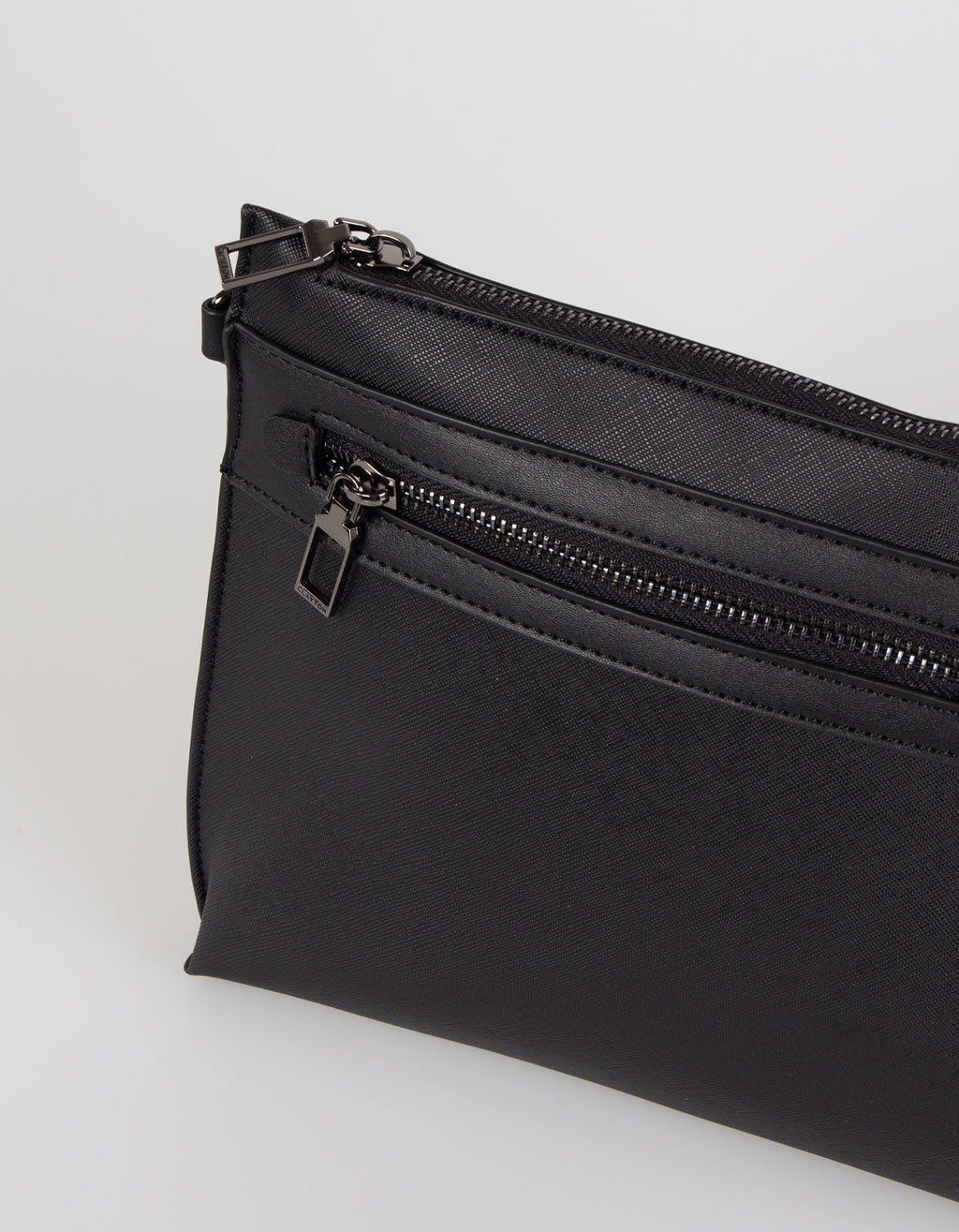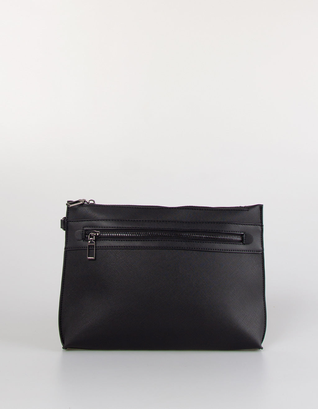 Borsello effetto pelle con chiusura zip e gancio laterale.