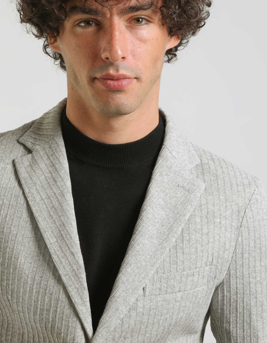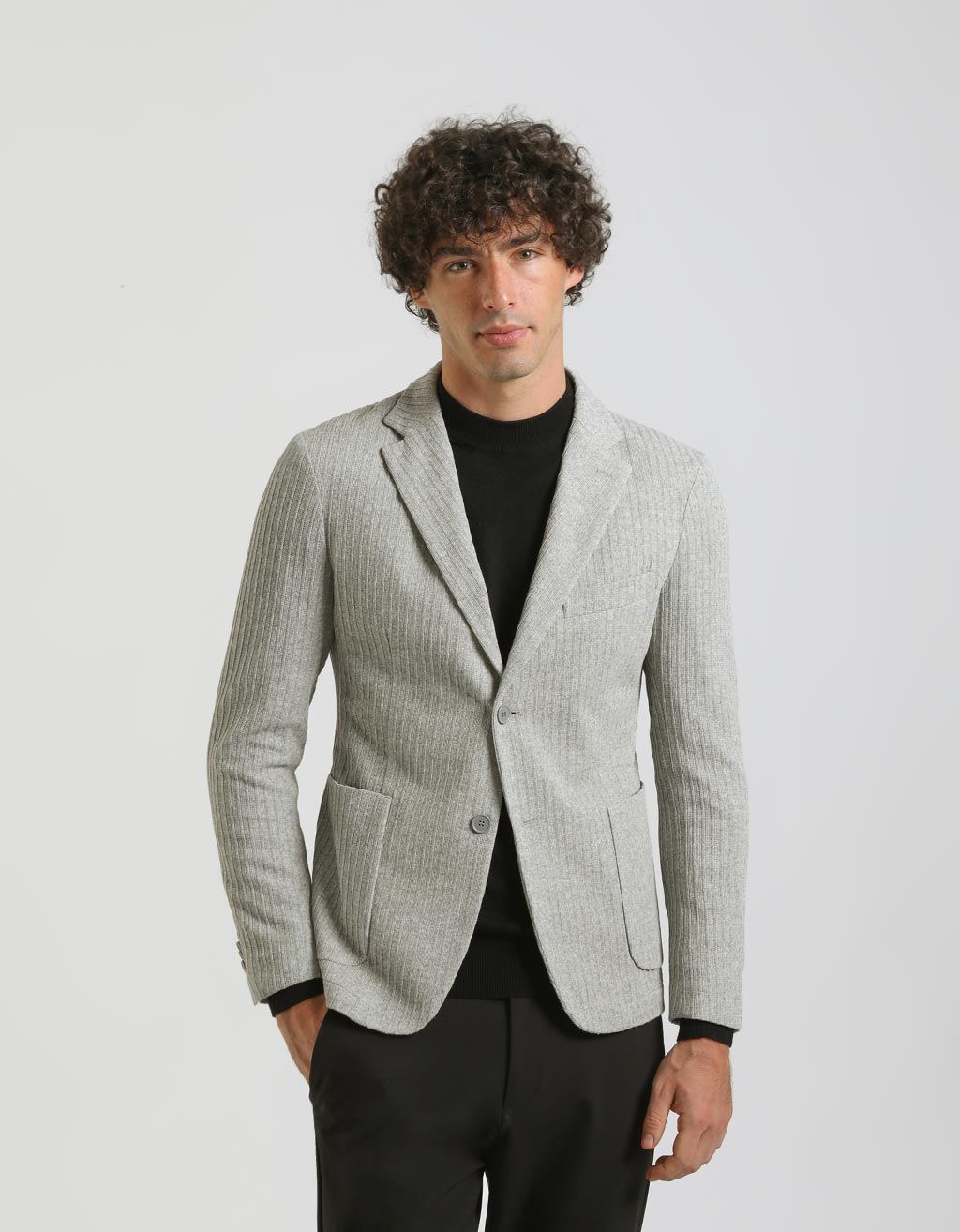 Giacca a coste verticali, con due bottoni con collo reverse classico, tasche a toppa laterali e tashino a filetto sul petto. Polsini con bottoni. "