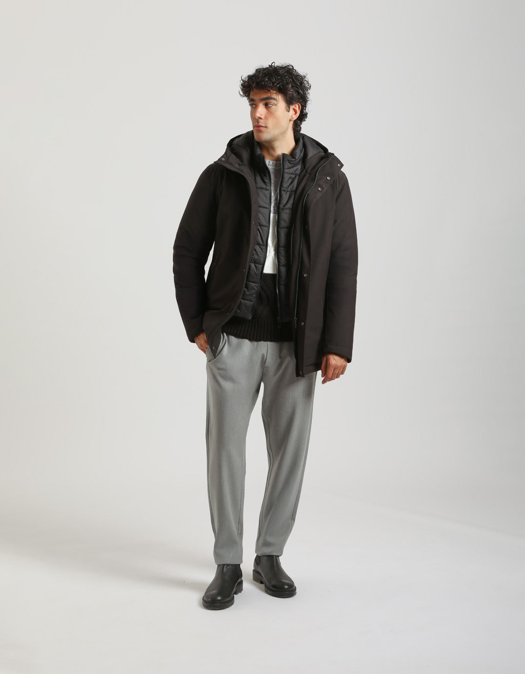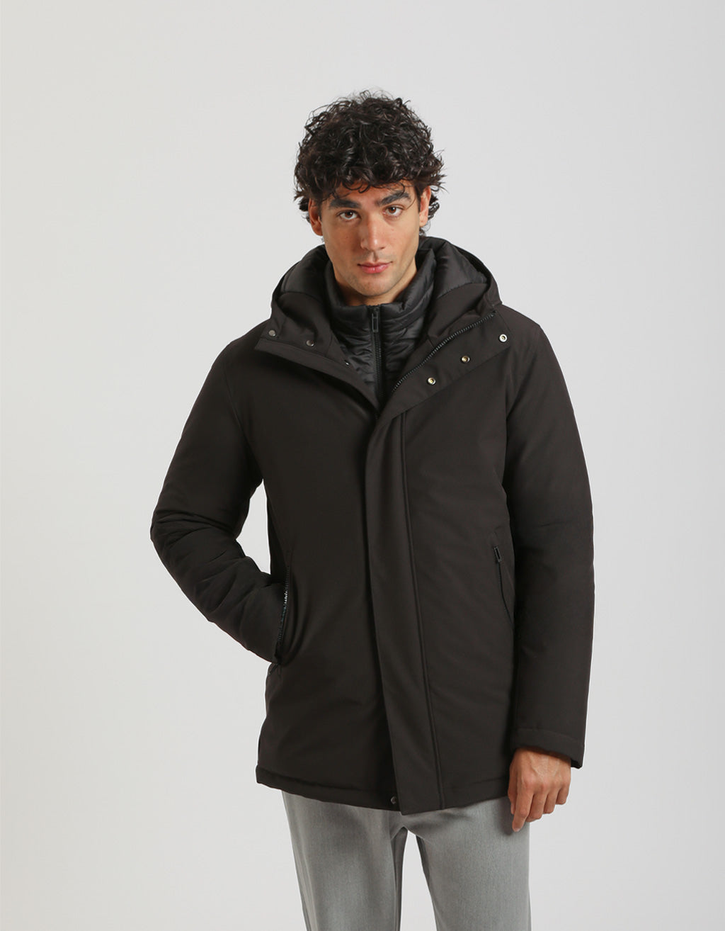 ALTEZZA MODELLO 185cm - TAGLIA L Giubbotto lungo spolverino con cappuccio e gilet, chiusura e tasche laterali con zip a contrasto.
