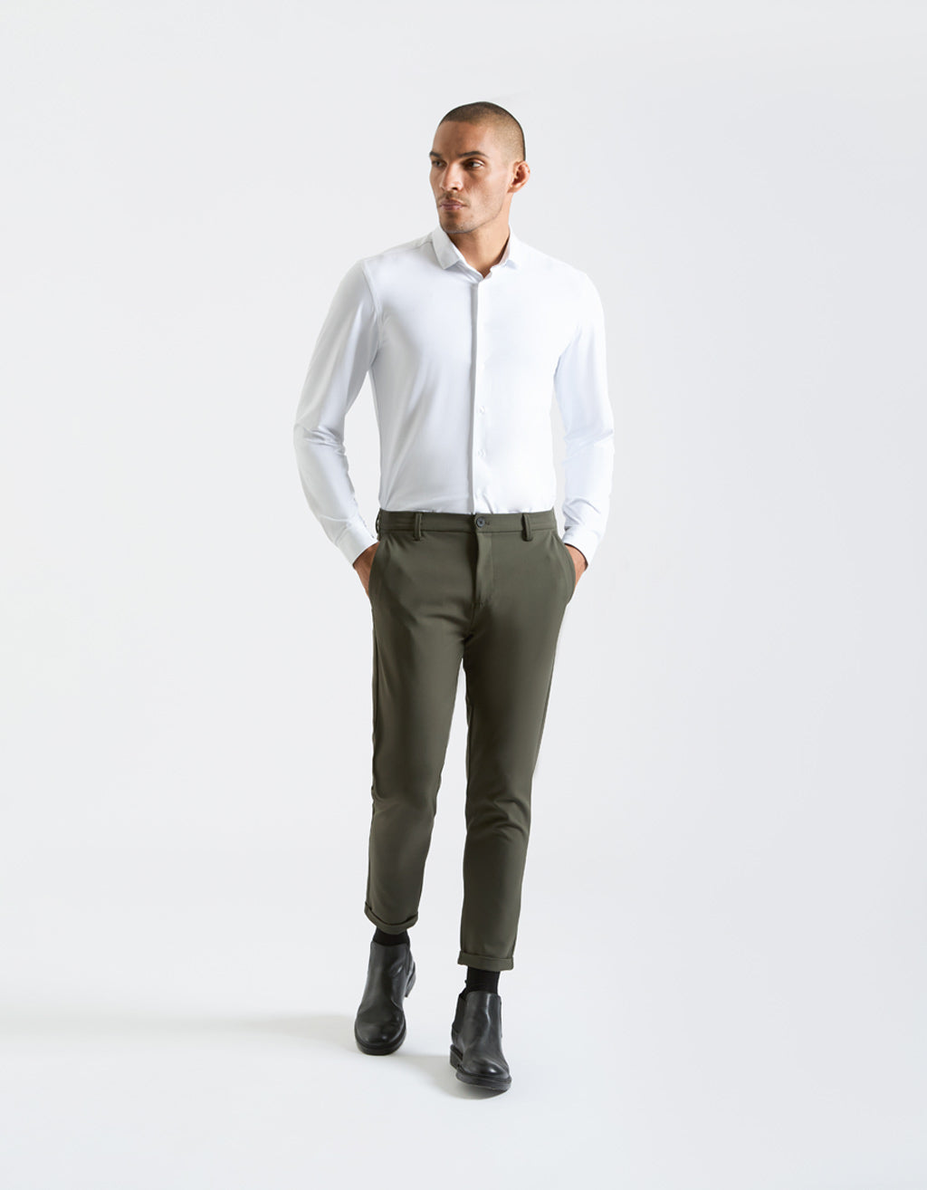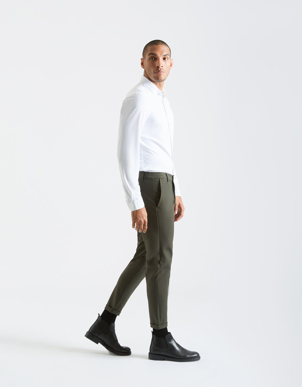 ALTEZZA MODELLO 185cm - TAGLIA 48 Pantaloni modello chino in nylon. Tasche america, taschino portamonete e due tasche doppio filetto con bottone posteriori. Chiusura frontale con cerniera e bottone. Slim fit.