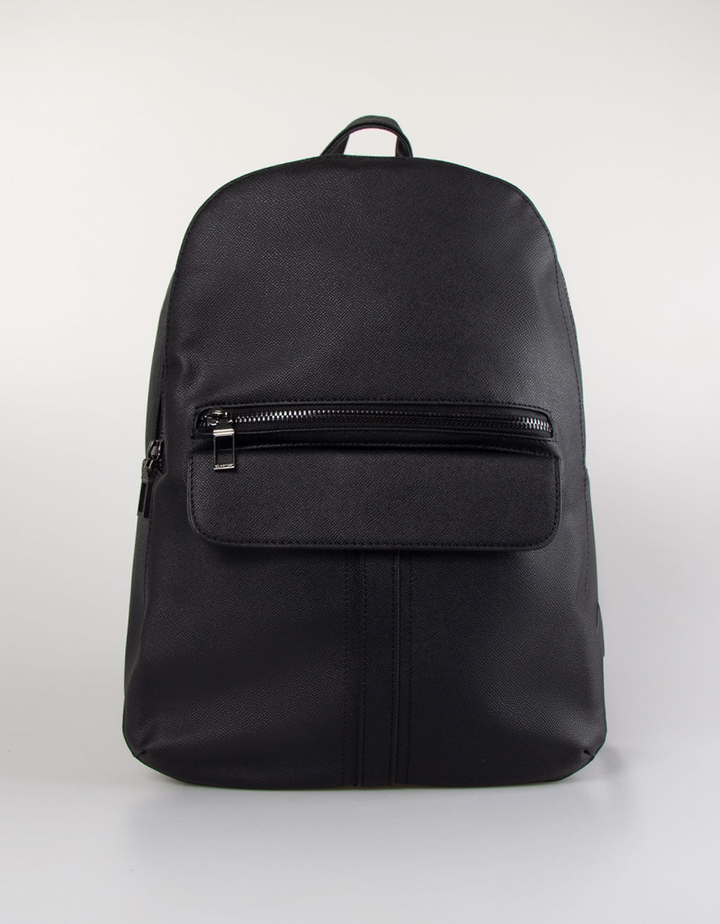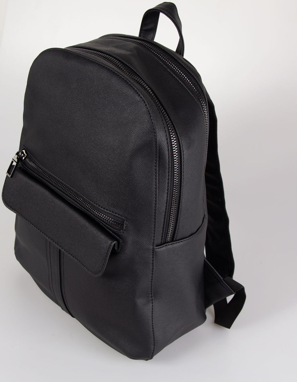 Zaino effetto pelle con doppia chiusura zip, doppia tasca frontale con zip e patta.
